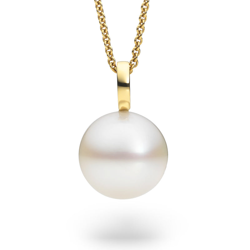 A semi-round white South Sea pearl pendant in 18ct yellow gold featuring a pearl measuring 10 - 11mm with a good lustre and few natural surface marks.