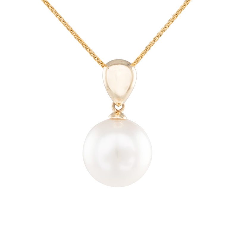 A semi-round white South Sea pearl pendant in 9ct yellow gold featuring a pearl measuring 12 - 13mm with a bright lustre and few small natural surface marks.