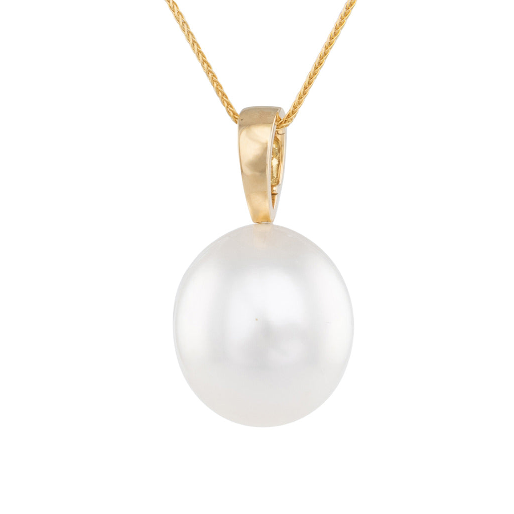 An oval white South Sea pearl enhancer in 18ct yellow gold featuring a pearl measuring 16.8 x 18.8mm with a good lustre and a few small natural surface marks.