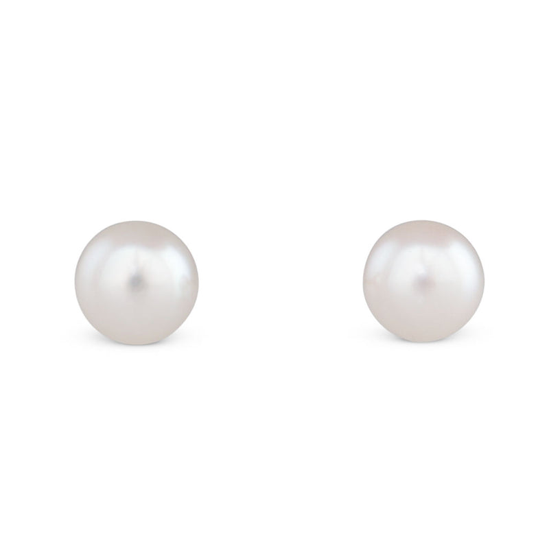 A pair of round white Japanese Akoya pearl stud earrings in 14ct yellow gold featuring pearls measuring 4 - 4.5mm with a good lustre and few natural surface marks.