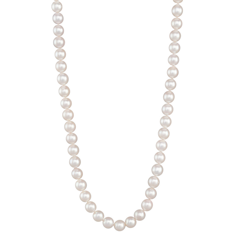 A strand of semi-baroque white Japanese Akoya pearls measuring 7.5 - 8mm with a good lustre and few natural surface marks. 51 pearls threaded to an 18ct yellow gold oval single diamond set clasp.