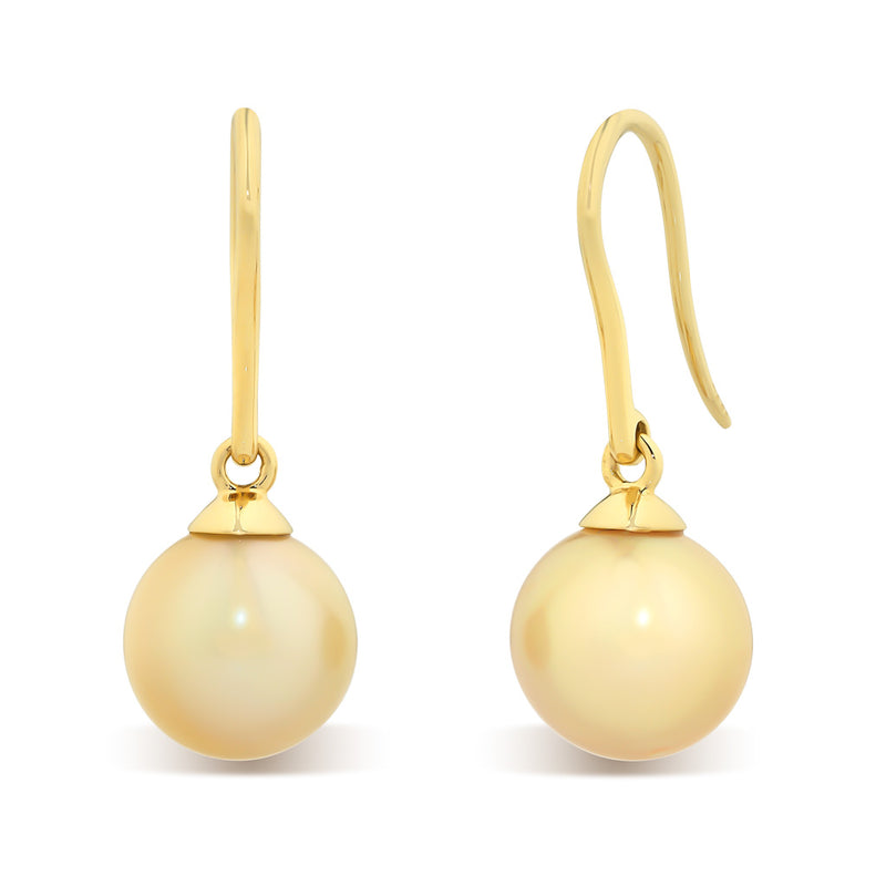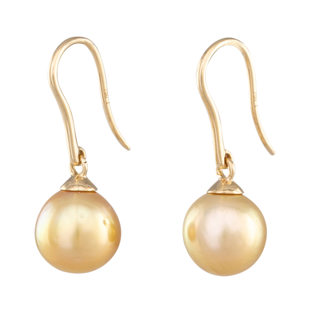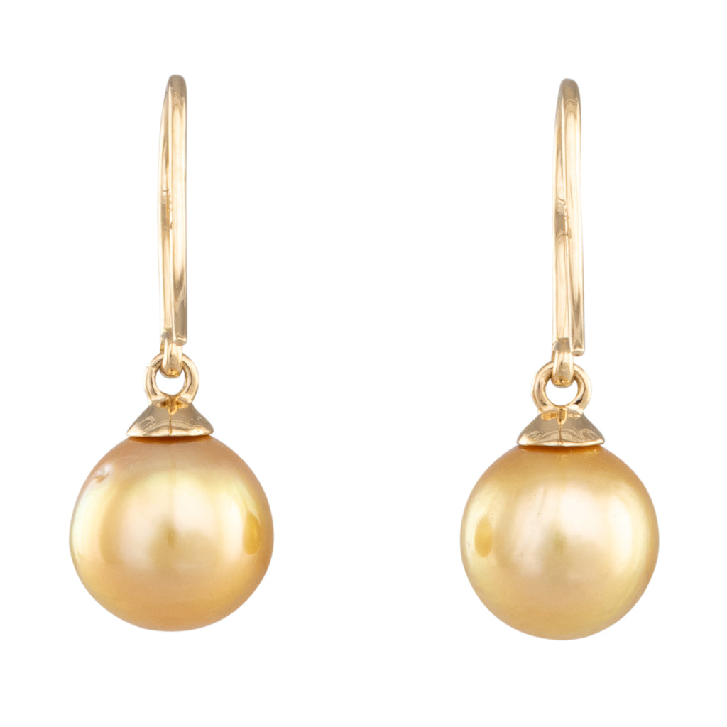 A pair of semi-round medium gold South Sea pearl articulated hook earrings in 18ct yellow gold with pearls measuring 9 - 10mm with a good lustre, even colour and few natural surface marks.