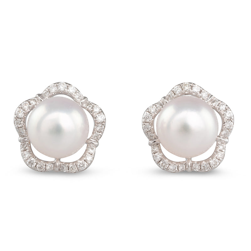 A pair of Akoya pearl and diamond earrings in 18ct white gold, each featuring an Akoya pearl measuring 7.8mm with good lustre, very few natural surface marks and a light pink hue. Micro claw set diamonds to the surround in a petal shape total 0.30ct.