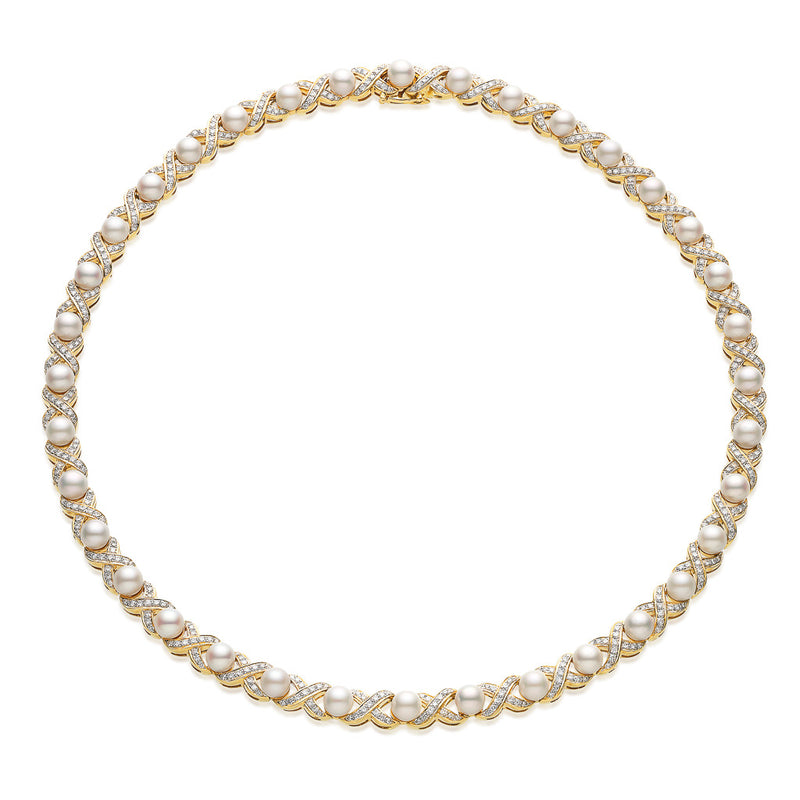 An Estate 18ct yellow gold Japanese Akoya pearl and diamond collar necklace featuring 36 pearls measuring 5 - 5.5mm with a bright lustre and few natural surface marks. The pearls are set with grain set diamond crossover-shaped links.