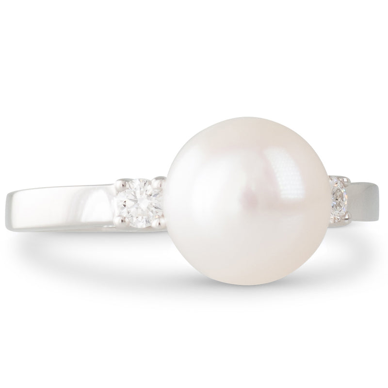 A round white Japanese Akoya pearl and two diamond ring in 9ct white gold with a pearl measuring 8 - 8.5mm with a bright lustre and few natural surface marks. The two brilliant cut claw set diamonds have a total weight of 0.10ct.