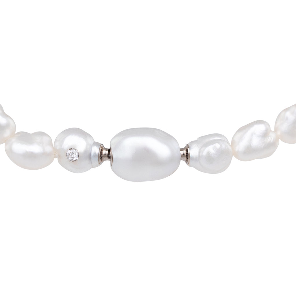A strand of white Australian South Sea Keshi pearls measuring 6.5 - 12mm with a bright lustre and natural pebble shaped Keshi shapes. 37 pearls in total, including one with a conceiled 18ct white gold clasp.