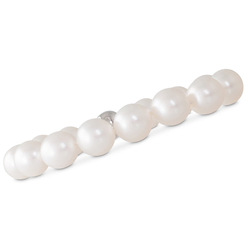 A bracelet of oval/semi-round white Australian South Sea pearls measuring 10.3 - 11.4mm with a bright lustre and very few natural surface marks. 15 pearls threaded to a polished 9ct white gold scattered diamond ball clasp.