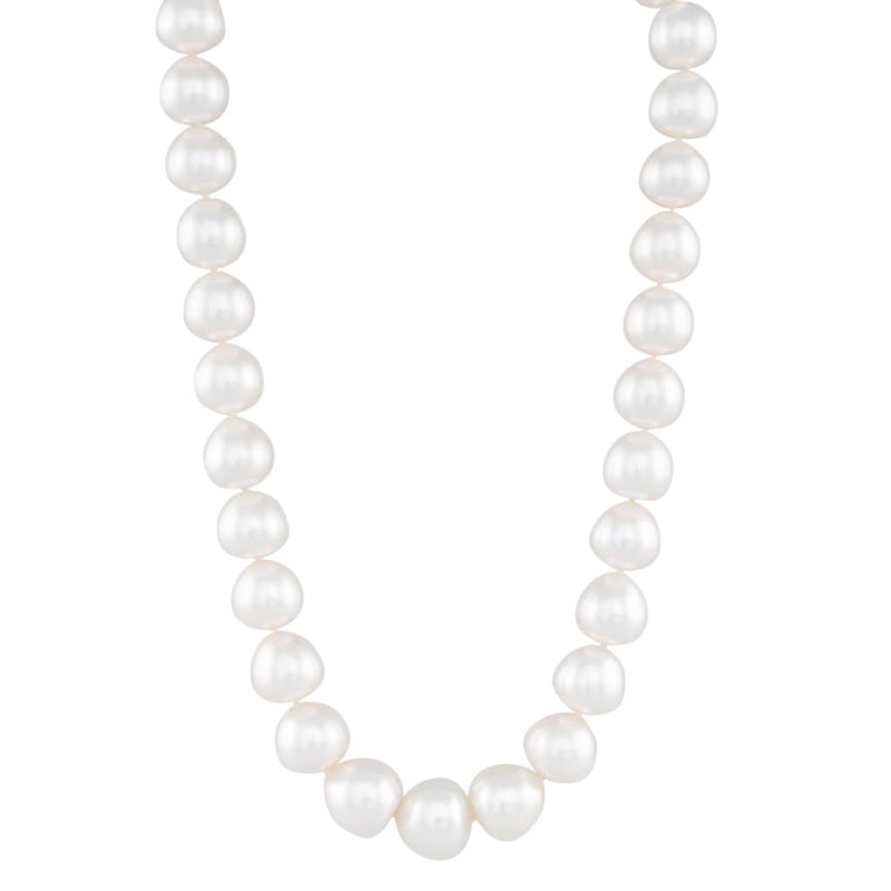 A strand of bell-shaped white South Sea pearls measuring 13 - 15mm with a bright lustre and very few natural surface marks. 31 pearls threaded to a ringed 18ct yellow gold clasp.