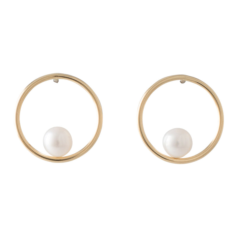 A pair of 18ct yellow gold fixed circle stud earrings in 18ct yellow gold featuring pearls measuring 5.5 - 6mm set fixed to the bottom of the circle. The pearls have a good lustre and few natural surface marks.