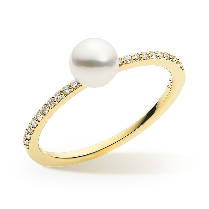 A round white Japanese Akoya pearl and diamond ring in 18ct yellow gold featuring a pearl measuring 5mm with a good lustre and few natural surface marks. The fine band features grain set diamonds with a total diamond weight of 0.10ct.