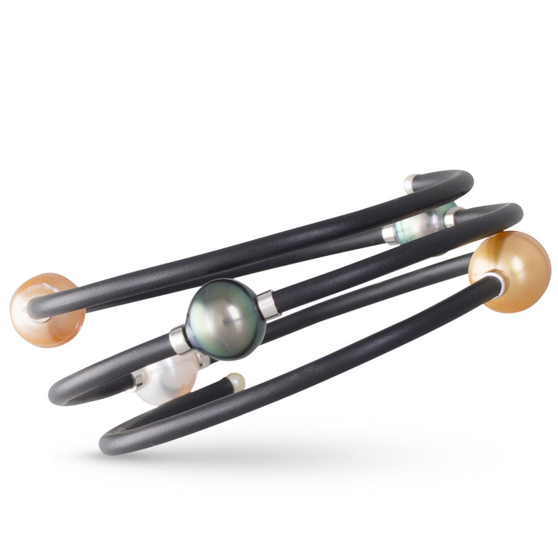 A black neoprene twist around bracelet featuring scattered semi-baroque mixed coloured South Sea pearls with silver details.  Five pearls measuring 9 - 10mm with a good lustre and some small natural surface marks.