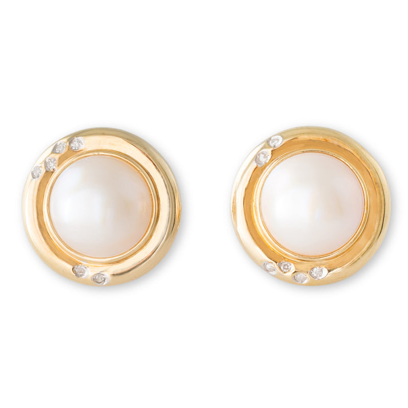 A pair of mabe pearl and diamond earrings, each pearl displaying fine lustre in a 14ct yellow gold fluted frame set with five round brilliant cut diamonds, post and clip fittings.