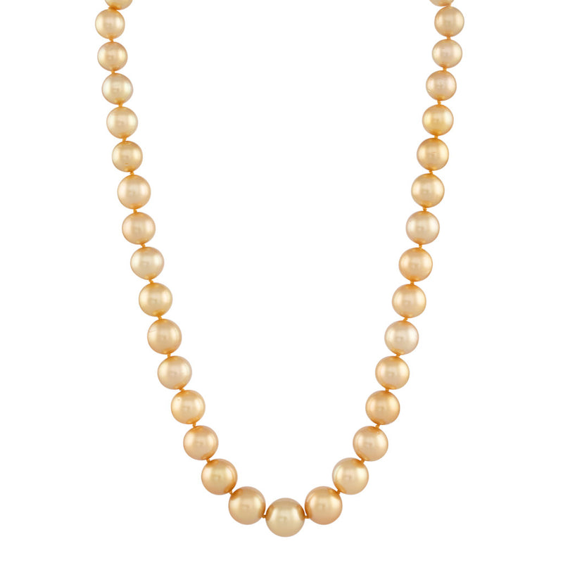 A strand of semi-round strong gold South Sea pearls measuring 9 - 12.1mm with a good lustre, slight colour variation and some small natural surface marks. 41 pearls threaded to a polished 9ct yellow gold ball clasp.