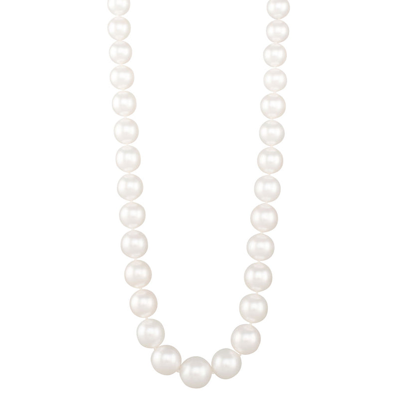 A strand of slightly semi-round white South Sea pearls measuring 10 - 14mm with a bright lustre and very few natural surface marks. 35 pearls threaded to a 9ct yellow gold matte finish ball clasp.