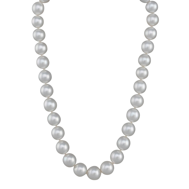 A strand of semi-round white South Sea pearls measuring 10 - 12.9mm with a bright lustre and very few natural surface marks. 35 pearls threaded to a 14ct white gold diamond set filagree interchangeable ball clasp.