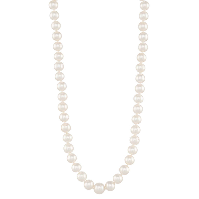A strand of semi-round white South Sea pearls measuring 8 - 10.3mm with a good lustre and some natural surface marks. 49 pearls threaded to a matte finish silver ball clasp.
