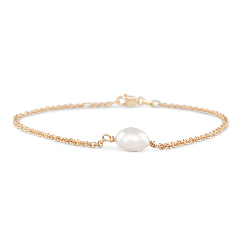 A single pebble shaped white South Sea Keshi pearl bracelet in 9ct yellow gold featuring a pearl measuring 8 - 9mm with a bright lustre and few natural surface marks. The cable link chain can be worn at 17cm or 18cm.