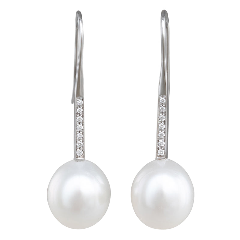 A pair of drop-shaped white South Sea pearl and diamond long fixed hook earrings in 18ct white gold featuring pearls measuring 12mm with a bright lustre and very few natural surface marks. The seven grain set diamonds have a total diamond weight of 0.09ct