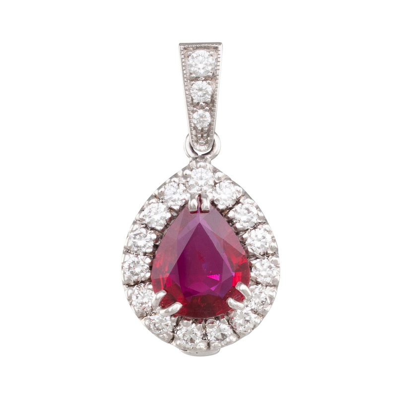An 18ct white gold pendant featuring a 1.23ct unheated pear cut Mozambique ruby accompanied by a GRS certificate, set in three split claws within a claw set border of fifteen round brilliant cut diamonds all to a scrolled gallery and suspended beneath a tapered diamond set bail.
