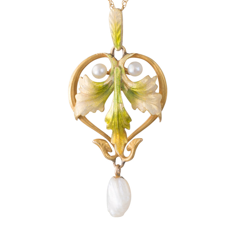 14ct yellow gold pendant with green enamelled leaves and seed pearls in a heart shaped gold frame, from the base a freshwater pearl. The bail also with green enamel leaf detail, through which is threaded a fine twist link chain which fastens with a bolt ring clasp.