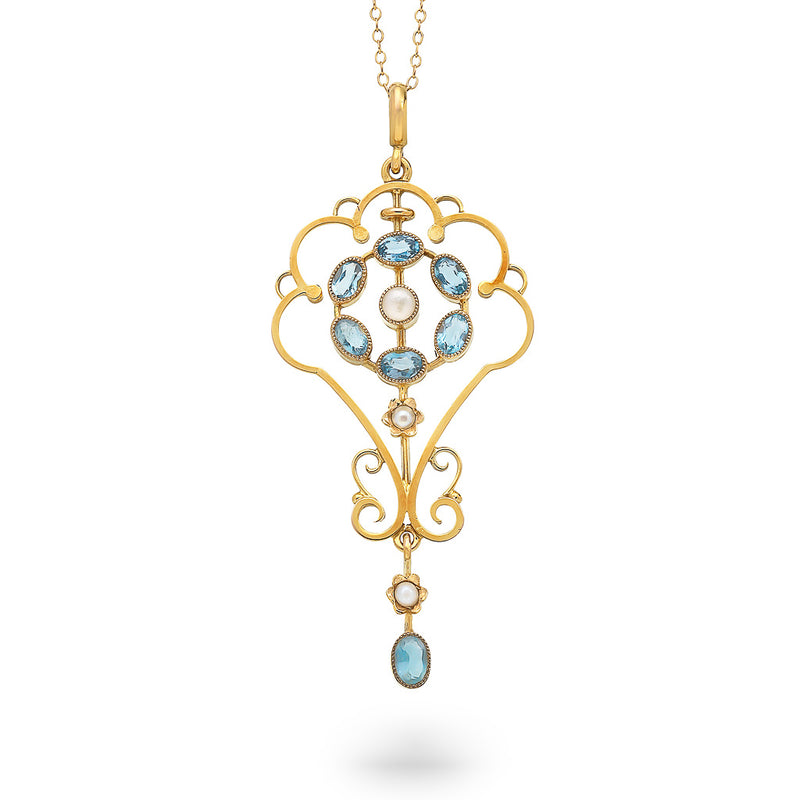 9ct yellow gold necklet in a floral design with oval aquamarines and seed pearls with a polished gold bail through which is threaded a fine trace chain, finished with a bolt ring clasp.
