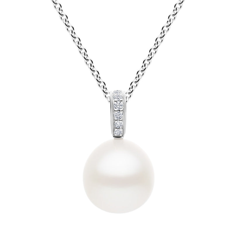 A Kailis Australian Hope South Sea pearl and diamond pendant in 18ct white gold featuring a drop-shaped pearl measuring 12mm with a bright lustre and very few natural surface marks.