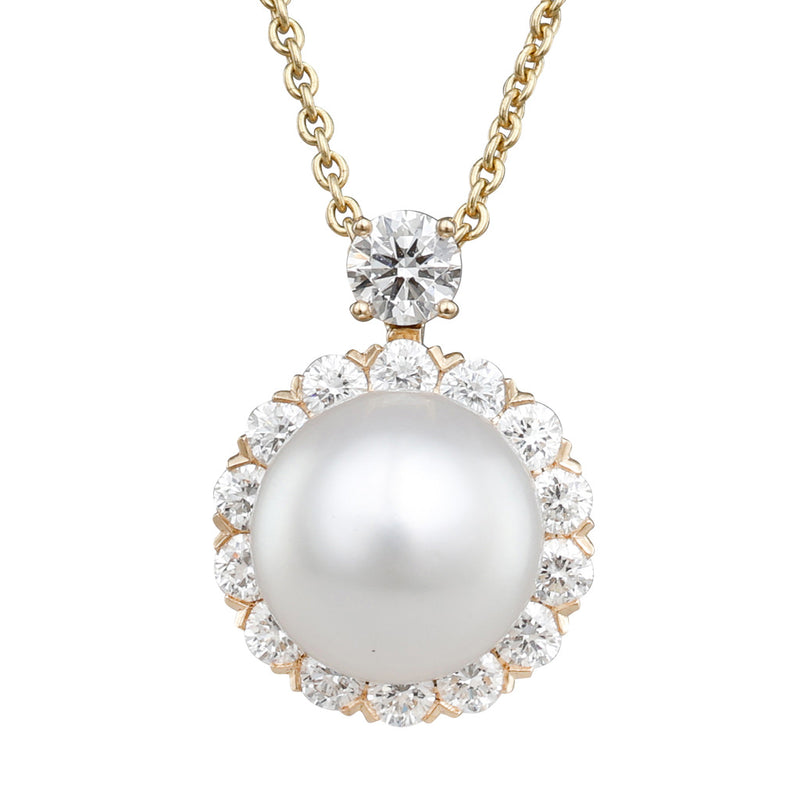 A round white South Sea pearl and halo diamond pendant in 18ct yellow gold featuring a pearl measuring 8mm with a bright lustre and few natural surface marks. The claw set diamonds have a total diamond weight of 0.56ct. Fine 18ct yellow gold trace chain included, 40cm.