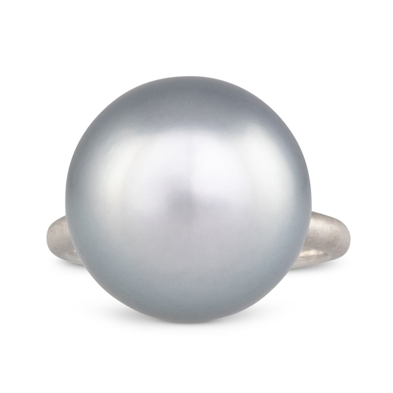 A round silver grey Tahitian pearl ring in 18ct white gold featuring a pearl measuring 15.2mm with a bright lustre and few natural surface marks. Matte finish band with a polished cup.,