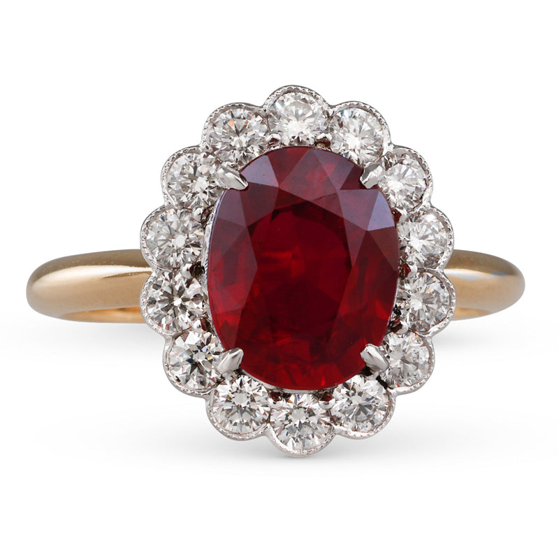 18ct yellow and white gold ring four claw set to the centre with a GRS certified 2.12ct oval Mozambique ruby surrounded by fourteen round brilliant cut diamonds in a scalloped and millgrained edge, to upswept spear point shoulders and a plain polished band.