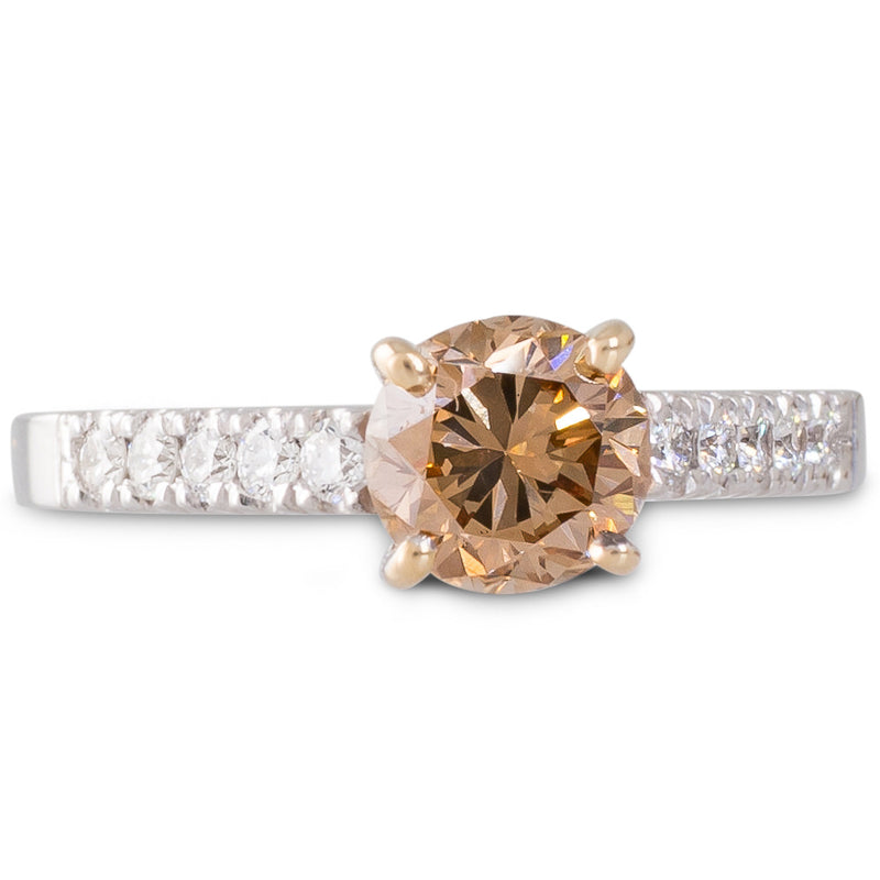A Champagne and white diamond ring, centrally set with a 1.11ct Champagne diamond (C4-5, VS) in a four claw 18ct yellow gold setting, and ten round brilliant cut diamonds totalling 0.24cts, F in colour, SI in clarity, claw set into upswept shoulders, in 18ct white gold on a plain polished band.