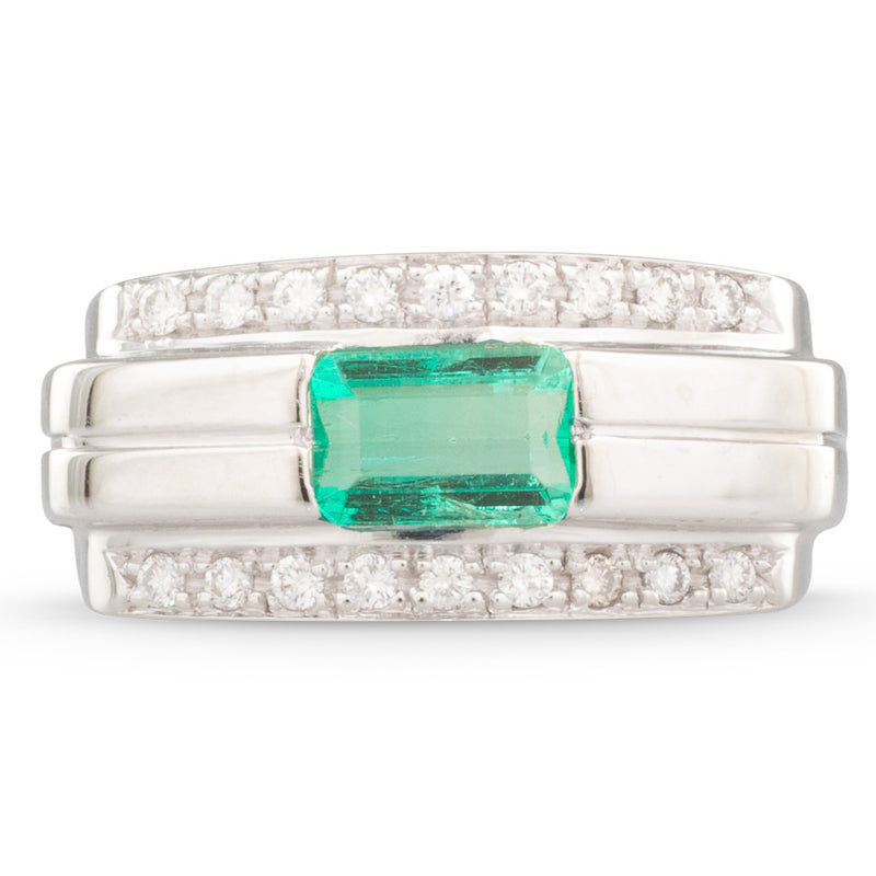 18ct white gold ring with an emerald cut emerald of estimated weight 0.95ct set horizontally to the centre, with wide shoulders, grooved and polished, and to either edge a row of grain set round brilliant cut diamonds, on a wide polished band.
