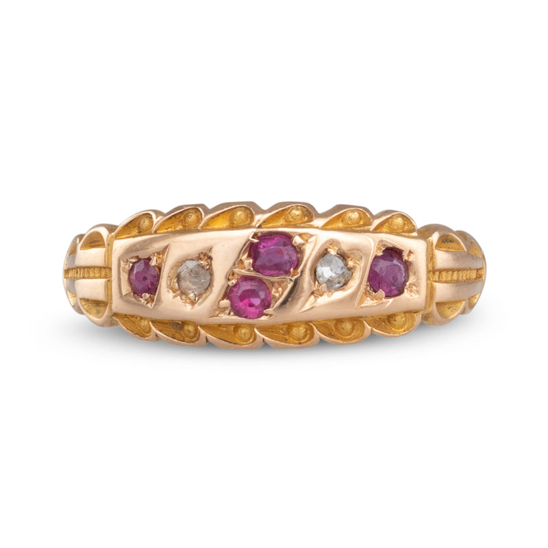 15ct yellow gold ring grain set across the top with four small rubies and two rose cut diamonds with a scalloped edge and scalloped shoulders on a polished band.