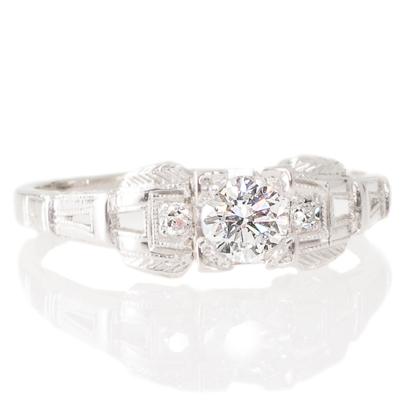Platinum Art Deco style ring set in four corner claws to the centre with a brilliant cut diamond of estimated weight 0.28ct, graded as colour F-G, clarity VS to decorative millegrained shoulders each set with a small diamond all to a polished shank.