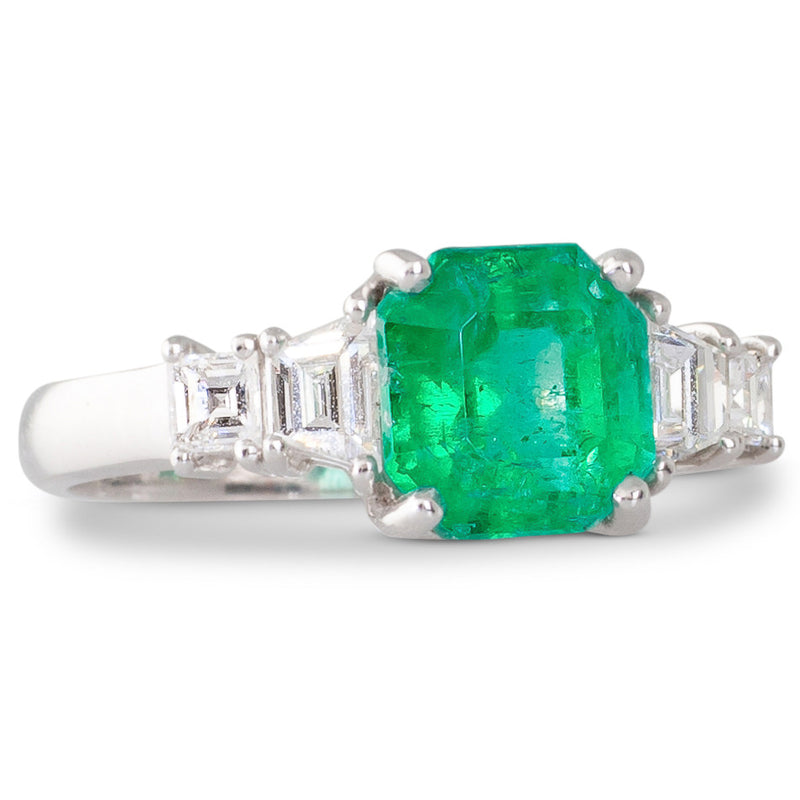 18ct white gold ring with a GIA certified 2.37ct Colombian octagonal emerald cut emerald four claw set in a double railed box mount and set to either side with a trapezoid and a carre cut diamond individually claw set in a railed setting which joins to the plain polished band.
