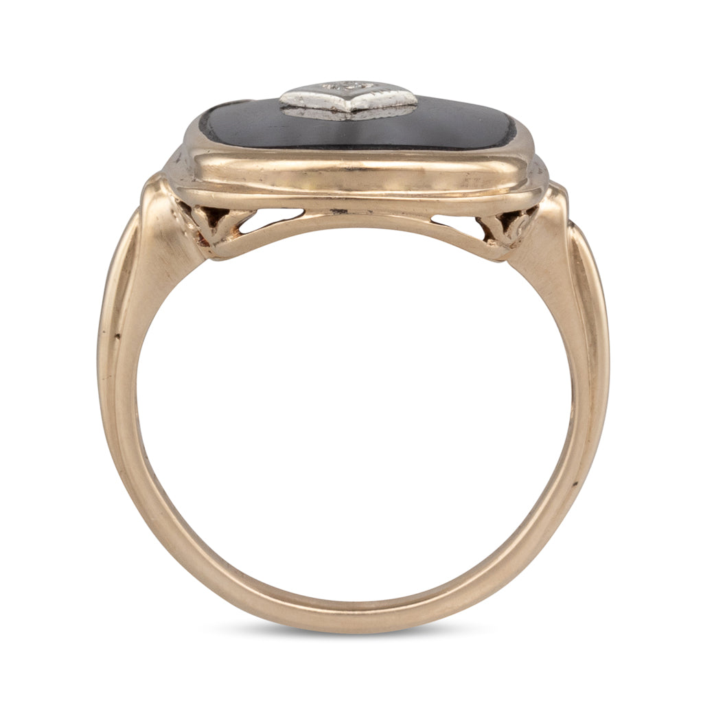 10ct yellow gold ring with a cushion shaped tablet of black onyx, a small diamond to the centre, on a filigree undergallery to curved shoulders and a polished band.