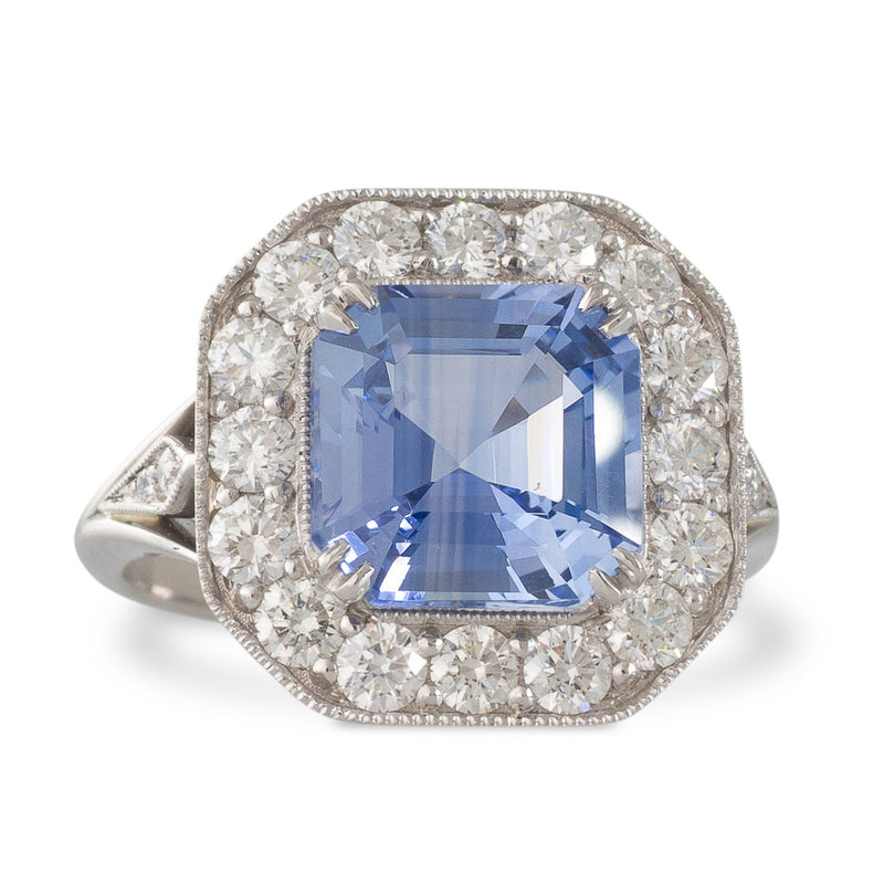 A platinum ring set with a 3.94ct octagonal shaped GRS certified Sri Lankan sapphire surrounded by sixteen round brilliant cut diamonds a further two diamonds on each upswept kite shaped shoulder with a mille grain edge and a polished band.