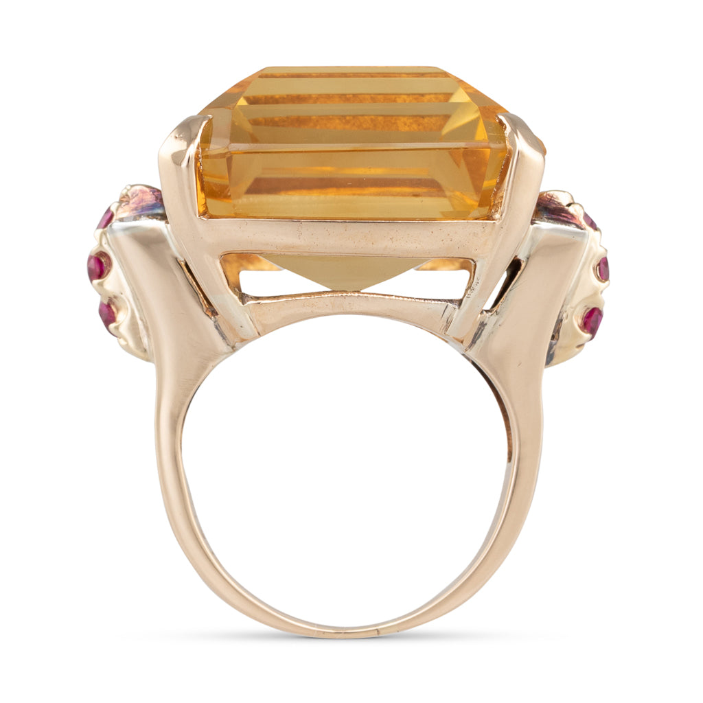 14ct rose gold ring four corner claw set with an estimated 41.70ct emerald cut citrine, to either shoulder three round rubies and two single cut diamonds on a polished band.