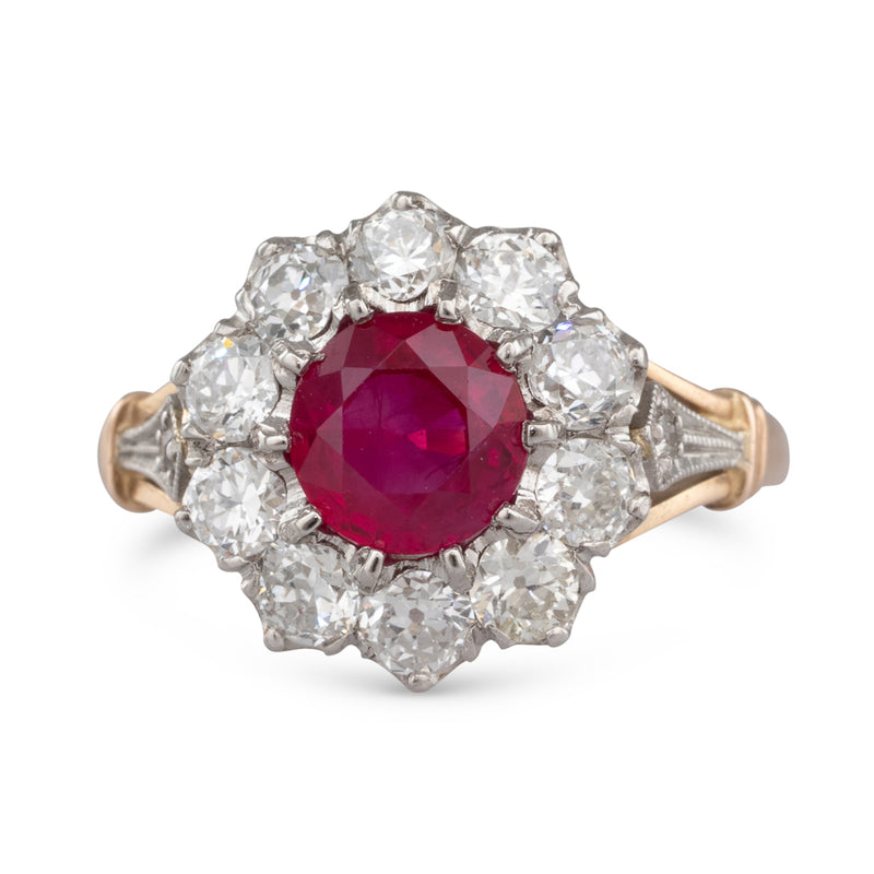 18ct rose gold and platinum cluster ring set to the centre with a round Burmese ruby of estimated weight 0.95ct, to the surround , in wine glass collets, eight old and two early brilliant cut diamonds with a further two diamonds to each spear head shaped shoulder on a forked rose gold band.