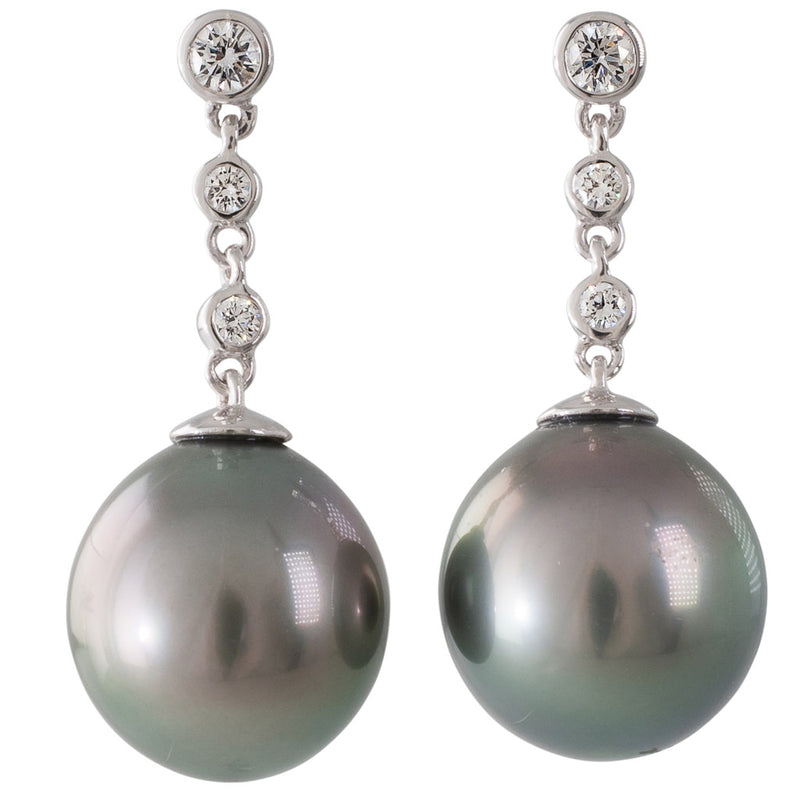 A pair of drop-shaped dark green/aubergine Tahitian pearl and triple diamond drop stud earrings in 18ct white gold with pearls measuring 11 - 12mm with a bright lustre and very few natural surface marks. The three bezel set diamonds have a total diamond weight of 0.31ct