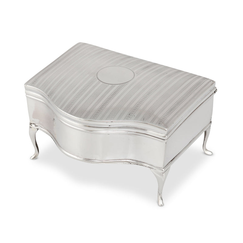 A dresser shaped sterling silver box with a hinged engine-turned engraved lid and a highly polished finish on four legs opening to original apricot velvet interior.