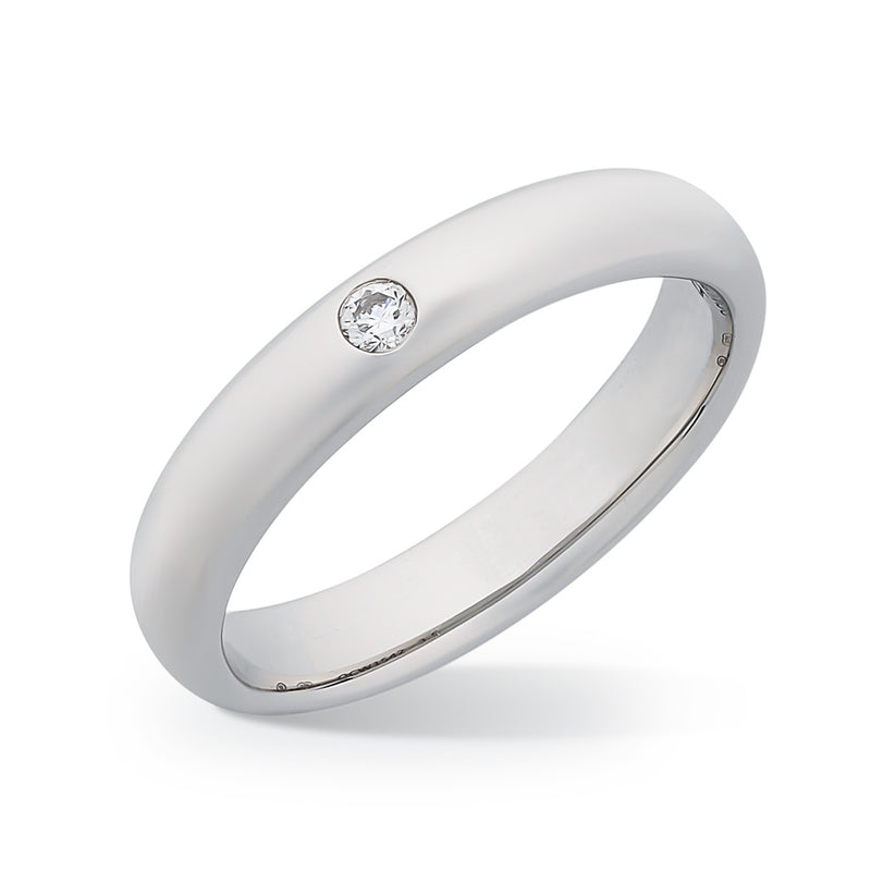 9ct white gold original comfort band, 3.5mm wide and hammer set to the centre with a 0.04ct round brilliant cut diamond.
