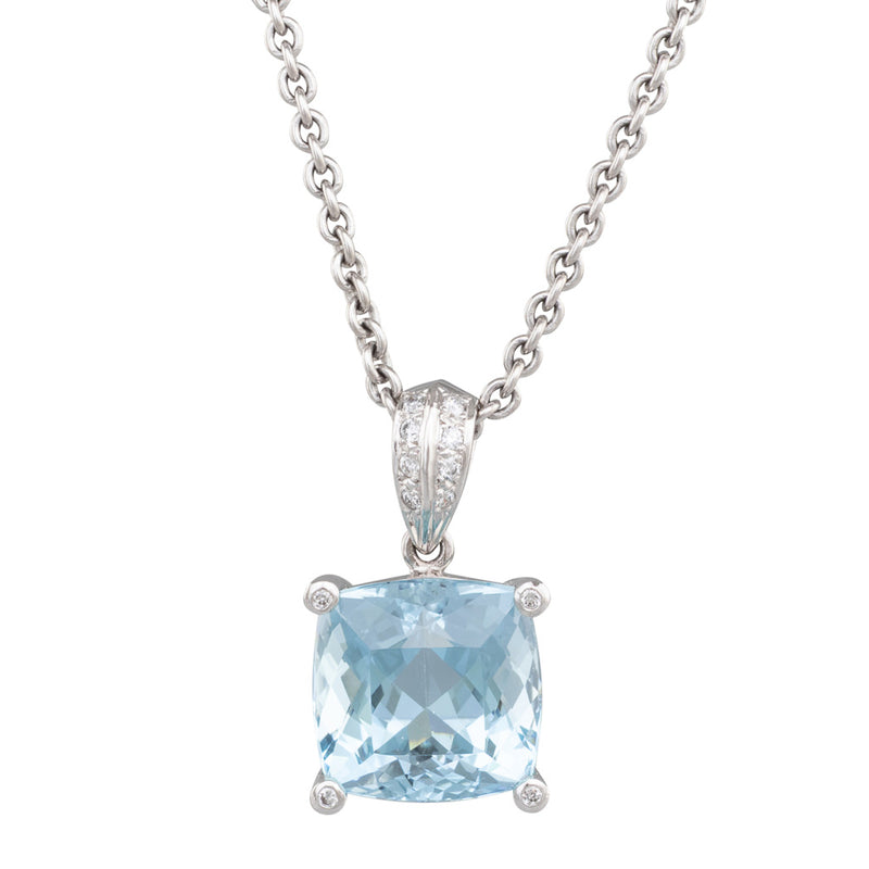 A 9.49ct cushion cut aquamarine, set as a pendant in 18ct white gold with four claws, a brilliant cut diamond set to top of each claw, from an articulated, tapered, diamond set bail, through which is threaded a 9ct white gold trace link chain.