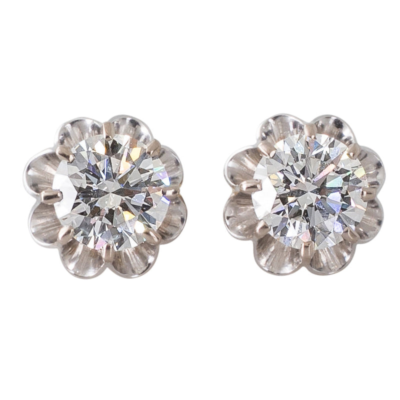 18ct yellow gold stud earrings, each with a GIA certified round brilliant cut diamond set in the scalloped platinum claws.