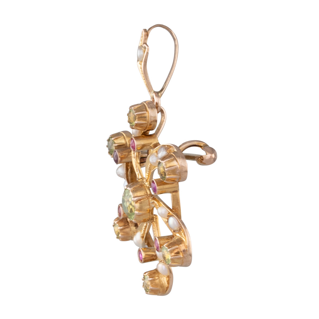 9ct yellow gold brooch/pendant in a pinwheel design with round peridots to the centre and six outer settings, six cabochon garnets evenly spaced and seed pearls, two to each petal, and one to the detachable fleur de lys style bail, fastening with a hinged pin and covered catch.