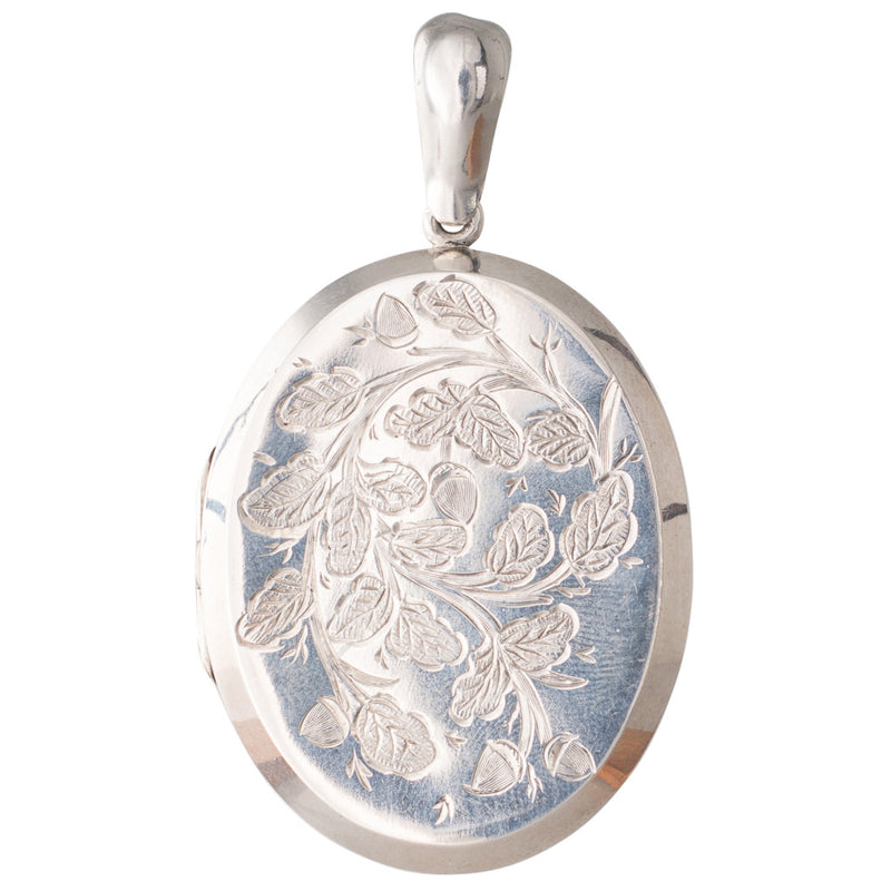 Sterling silver locket, the oval locket engraved with acorns and leaves to the front, plain polished to the reverse, opening to reveal two photo compartments from a polished bail and hallmarked for sterling silver, Chester and 1882.